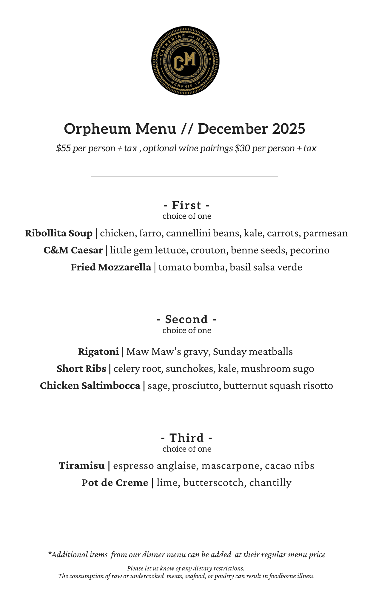 DECEMBER ORPHEUM MENU